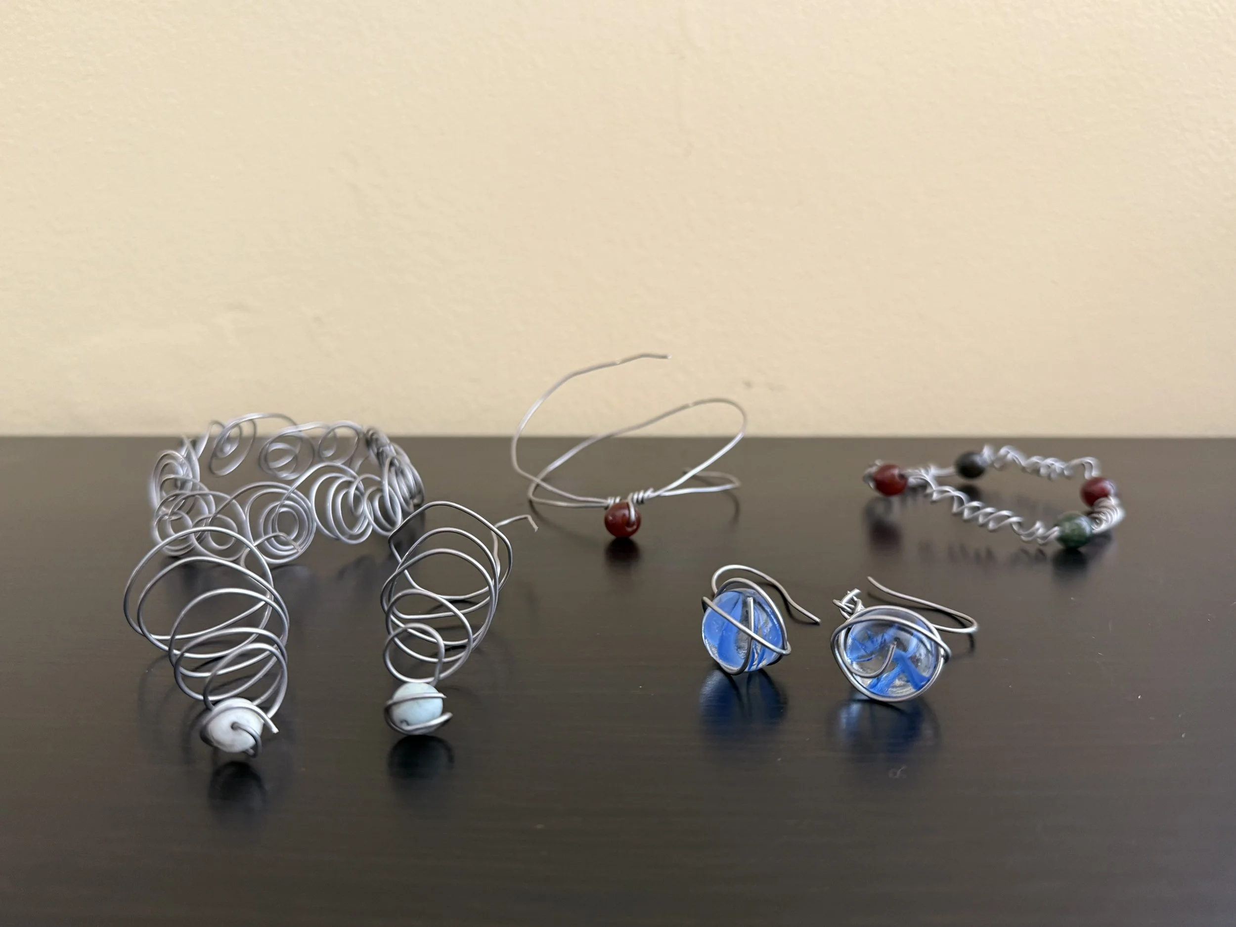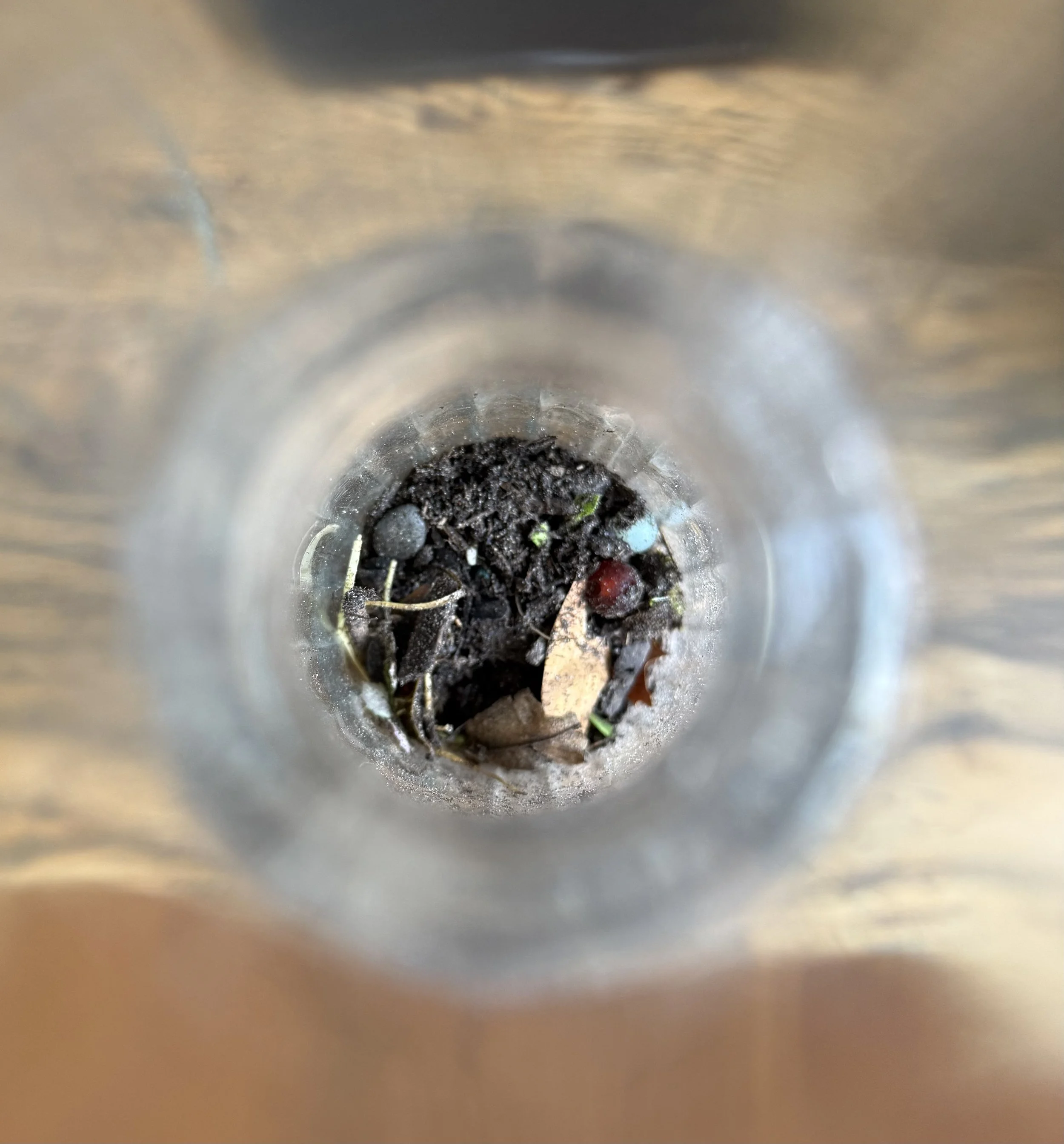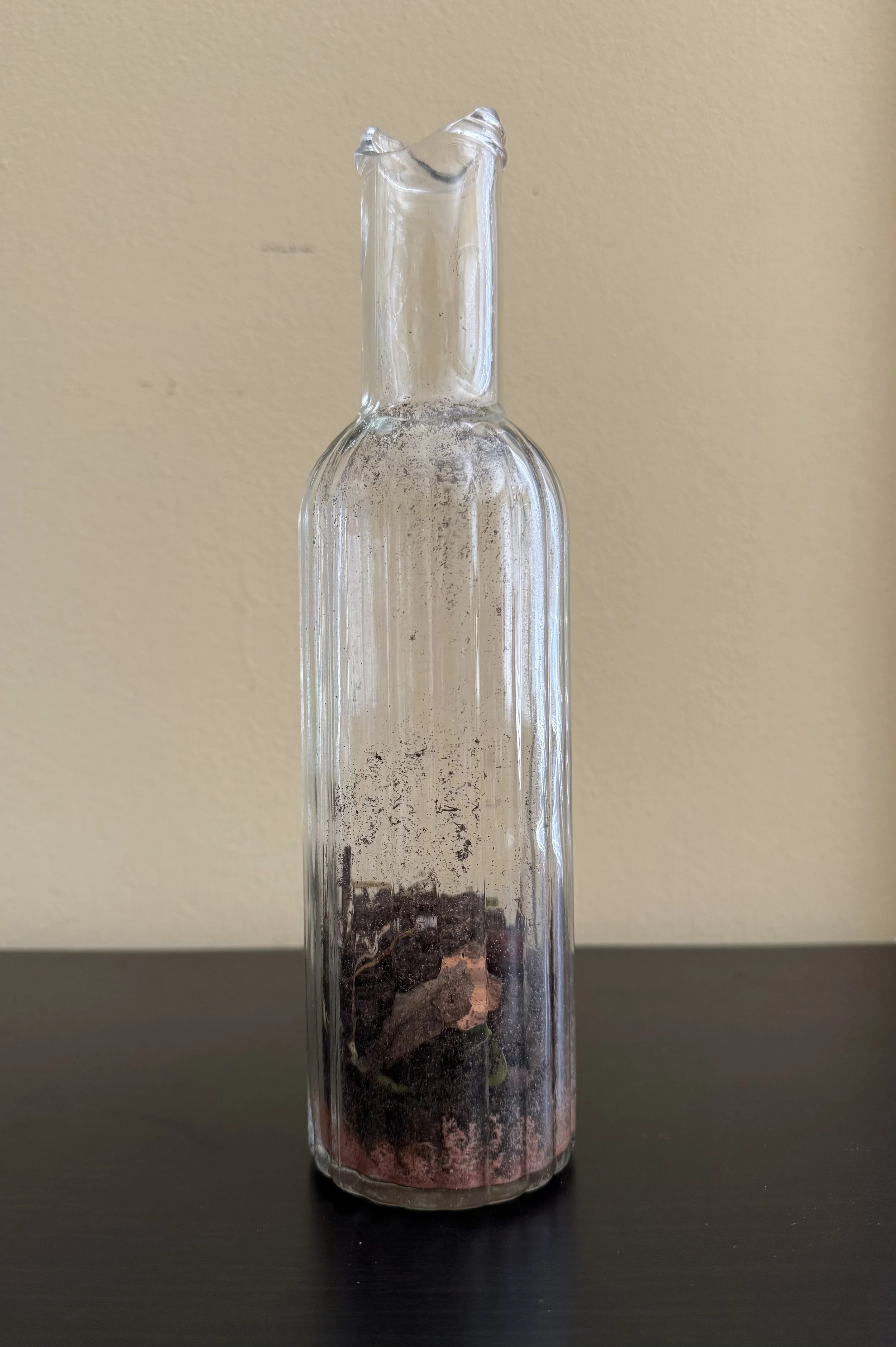 the broken glass bottle is filled with dirt, leaves, twigs, pebbles, perinian jewelry beads, and broken pieces of wood carved by perinians.